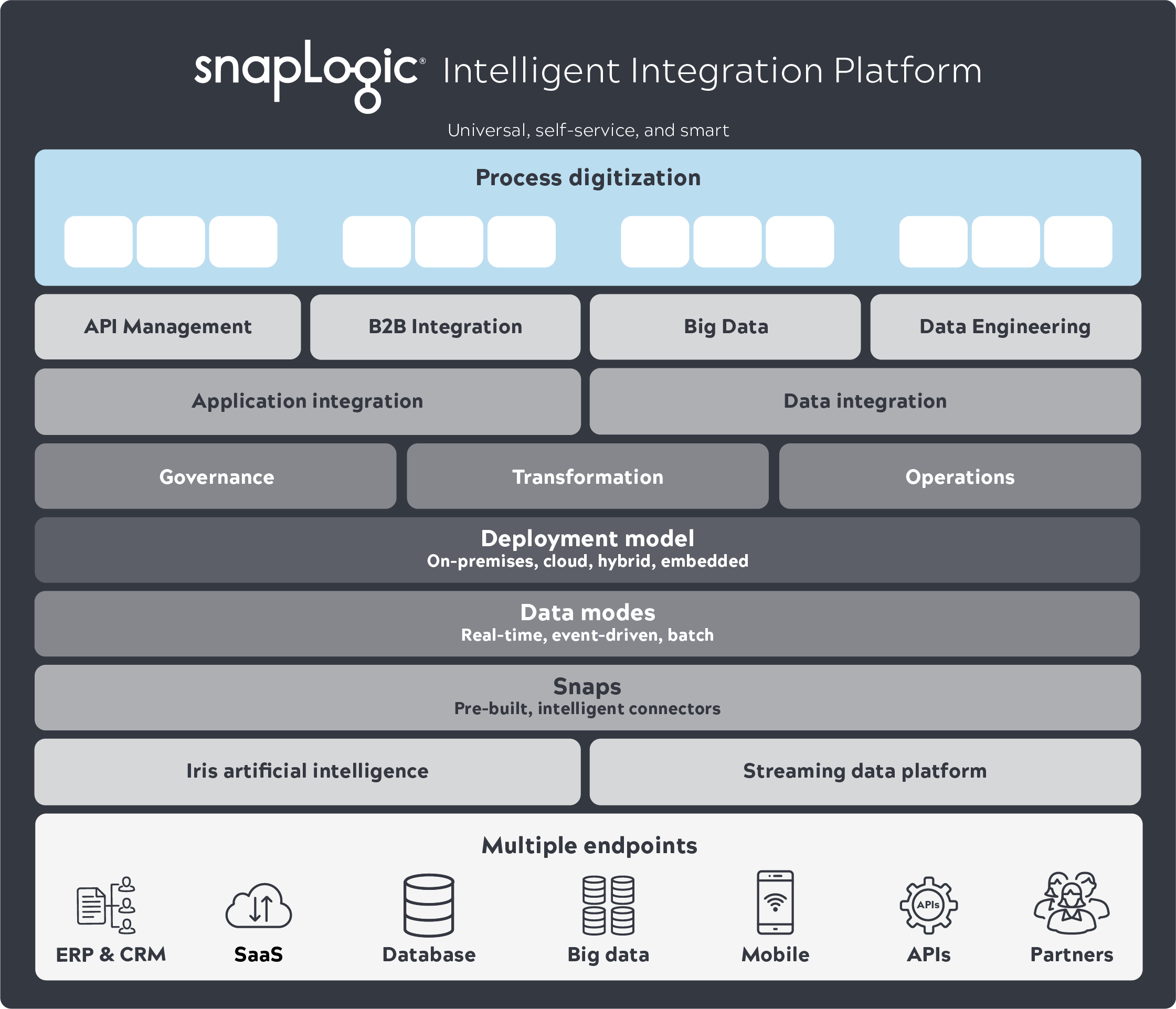 SnapLogic’s document-based JSON and REST-based parallel processing architecture manages real-time streaming data for application and business process integration. Scale high-volume batch integration and aggregation for data warehousing and analytics.