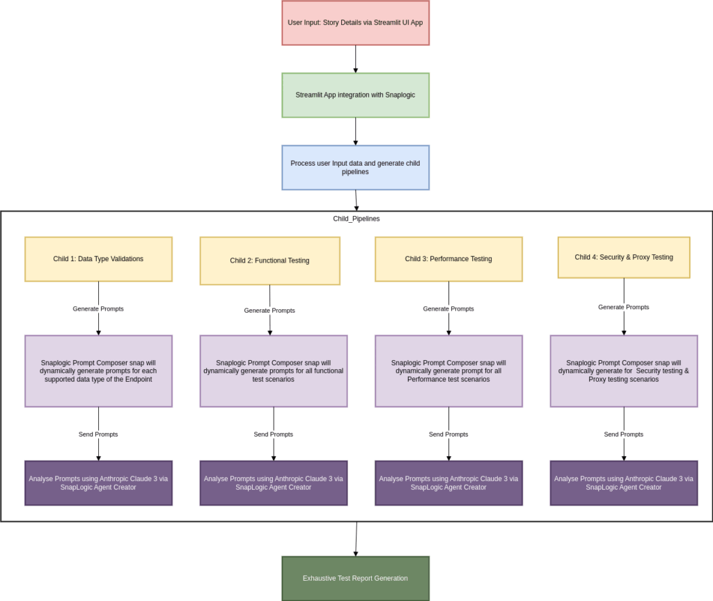 Once this information is submitted, it is routed to SnapLogic, where the input is parsed and passed to dynamically triggered child pipelines, each tailored for a specific test type: