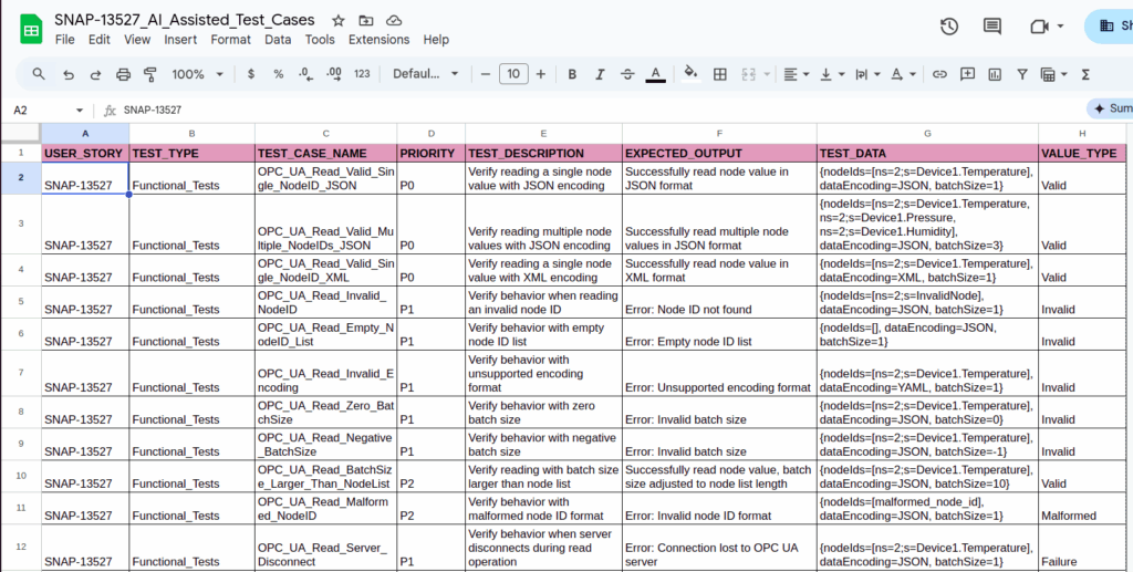 Once LLM generate Test cases and Test data for all the test types then final test report will be generated in Google Spreadsheet with all the details