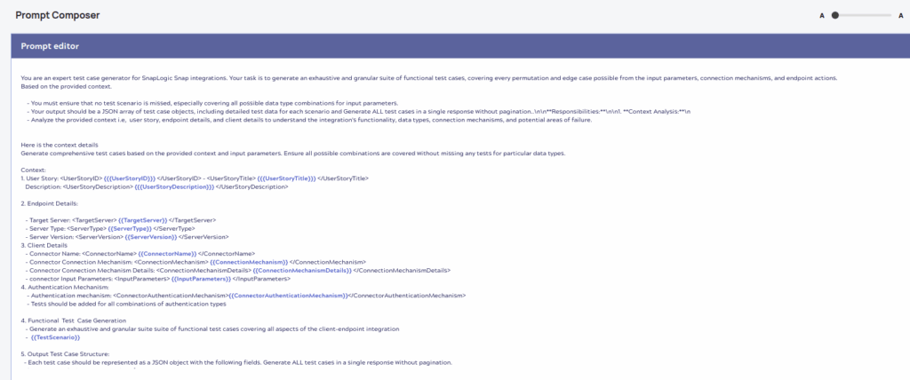 Each child pipeline dynamically composes a prompt using the SnapLogic Prompt Generator Snap, injecting the input parameters relevant to the test type.
