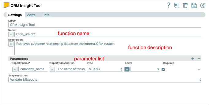 - With it, users can directly select the desired pipeline to be used as a tool from a dropdown menu. The snap will automatically retrieve the tool name, purpose, and parameters from the pipeline properties to generate a function definition in the required format.
