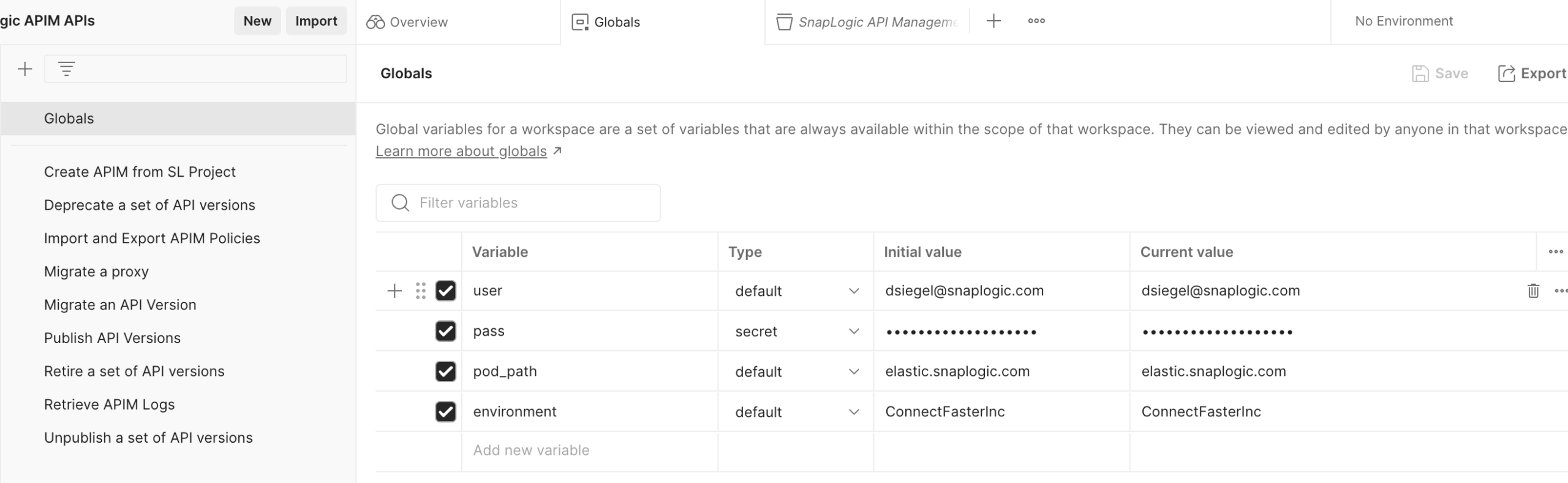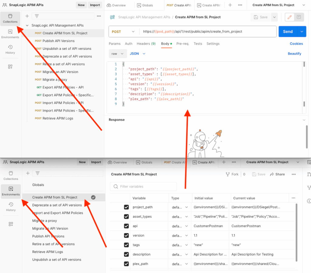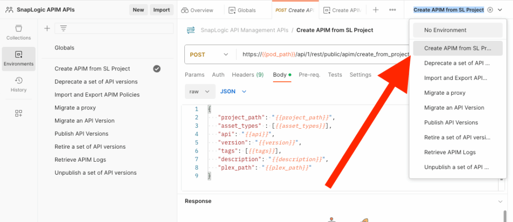 As an example, an integrator may already have a set of SnapLogic pipelines in a project that are intended to be available as APIs in APIM for use across the organization. The first step in this process is to fill out the variables for their project in the proper Postman environment. In the collection attached to this post, each request in the collection will have a corresponding environment. For the request Create APIM from SL Project, the corresponding environment is also called Create APIM from SL Project.