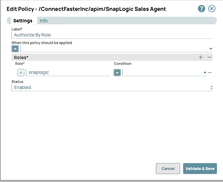 Once the token is validated, the Authorize By Role policy inspects the username (email) returned by Salesforce. You can configure this policy to allow access only to users from a trusted domain (e.g., @snaplogic.com), ensuring that external users cannot exploit your API.