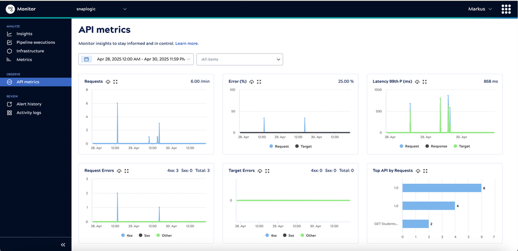 Security doesn’t stop at implementation. Ongoing monitoring is critical for identifying potential misuse or intrusion attempts. SnapLogic’s API Management interface provides detailed metrics that can help you: