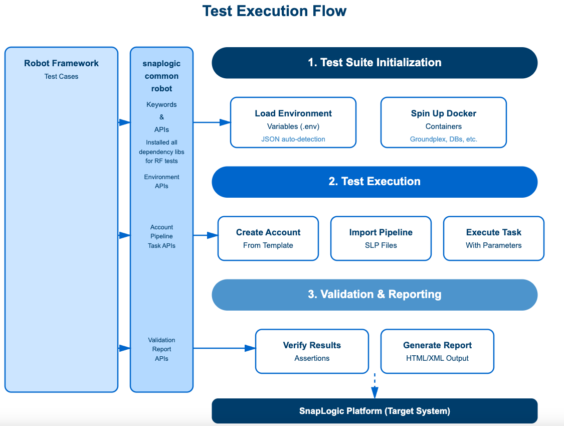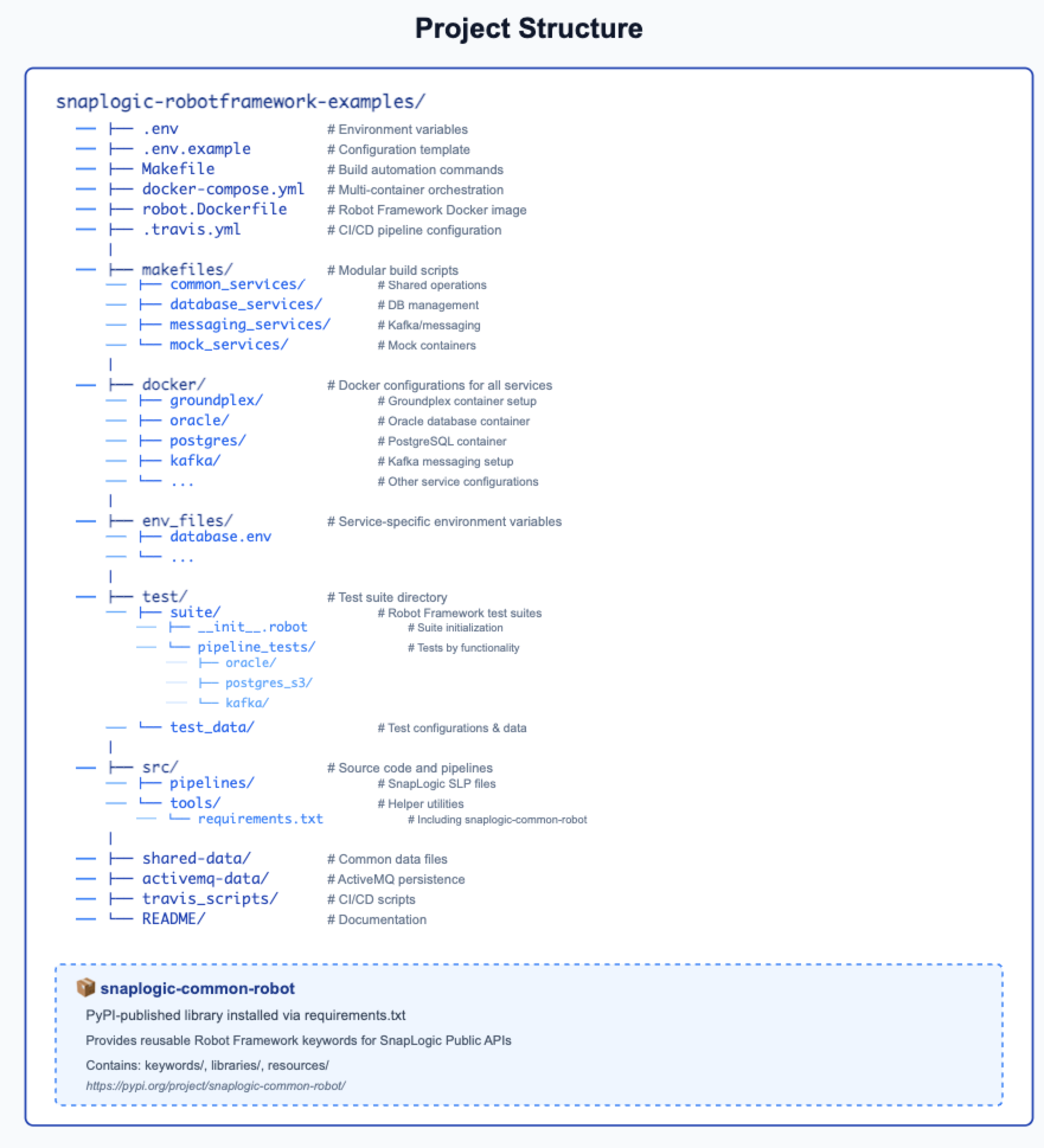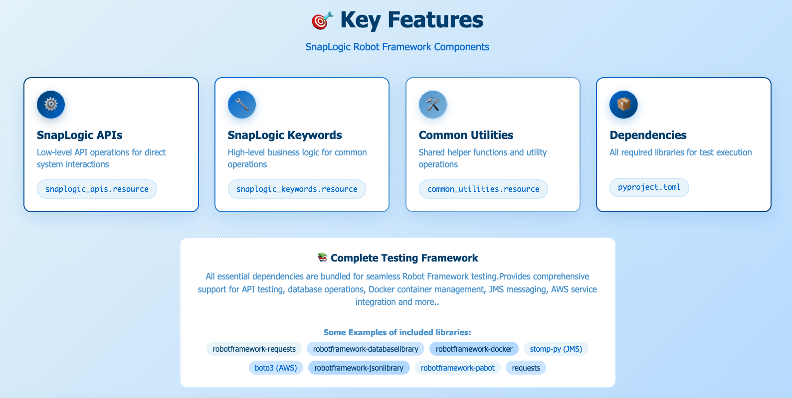 • snaplogic-robotframework-examples: A public repository providing a complete testing framework with baseline test suites and Docker-based infrastructure for comprehensive end-to-end pipeline validation