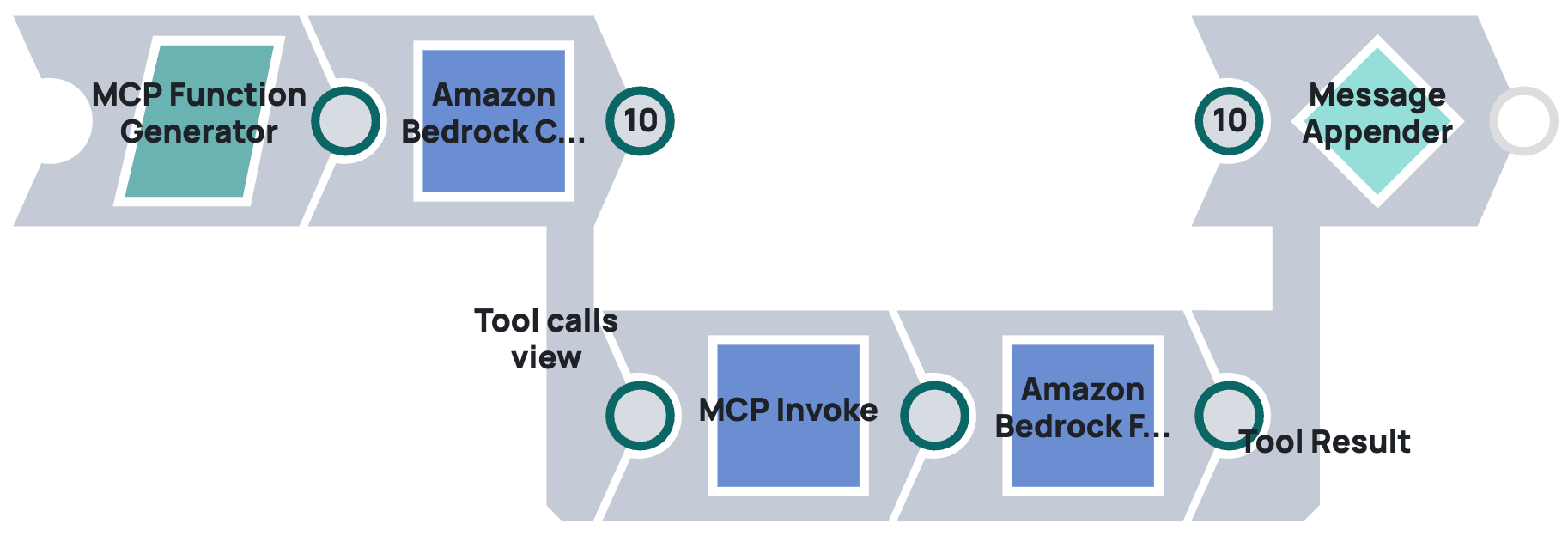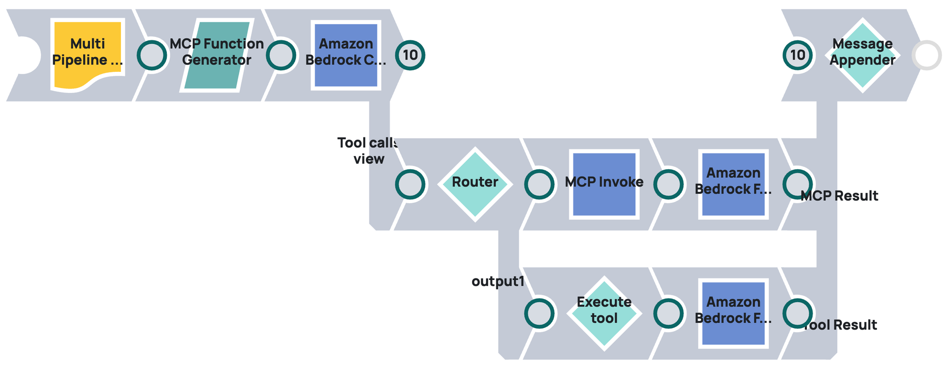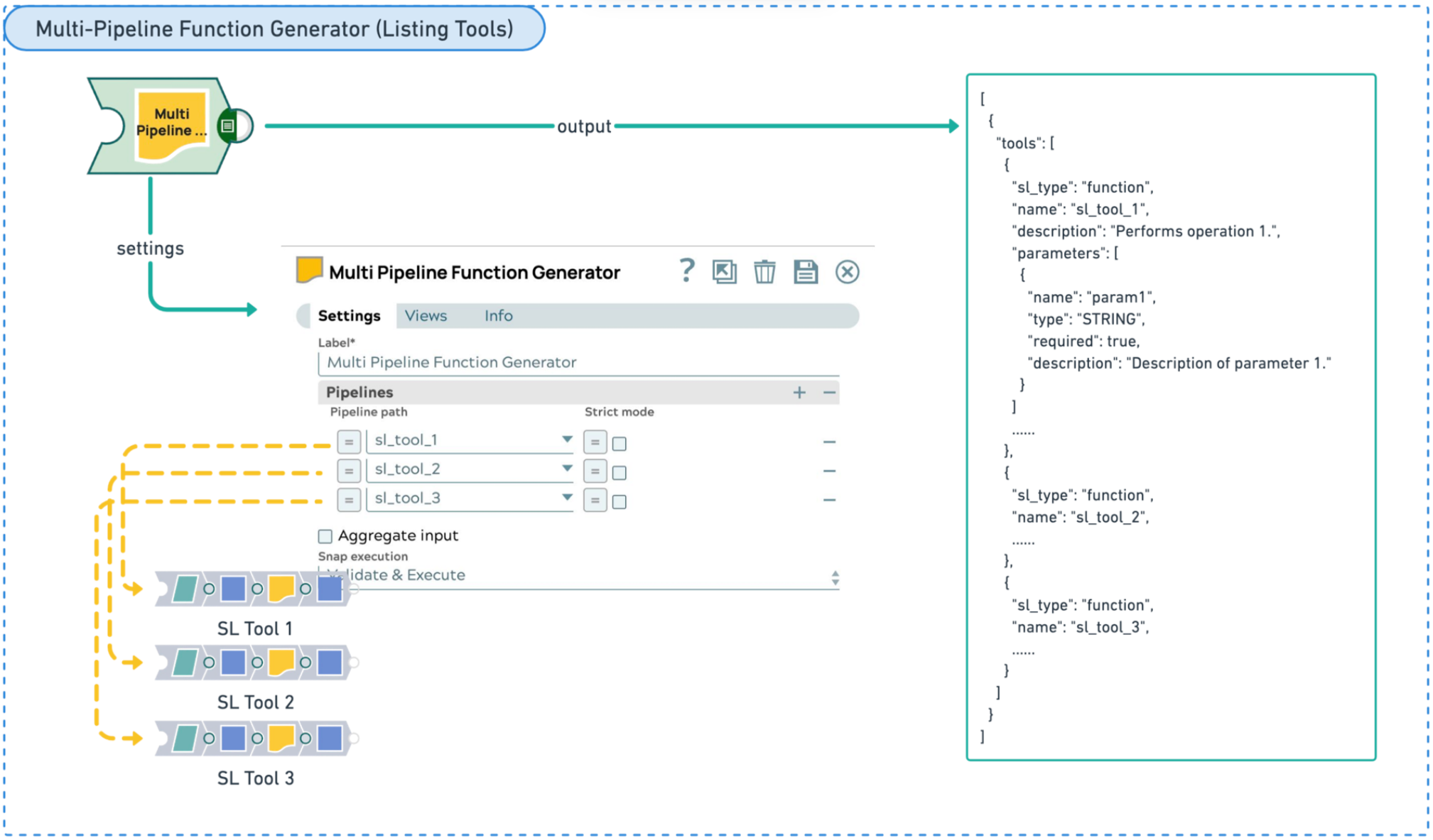 Les snaps MCP Client peuvent être utilisés avec les snaps AgentCreator , tels que le générateur de fonctions multi-pipeline et le snap d'exécution de pipeline, en tant qu'outils SnapLogic Functions. Cela permet aux utilisateurs d'utiliser les outils fournis par les serveurs MCP et les outils internes, sans sacrifier la sécurité et la liberté lors de la création d'un agent.