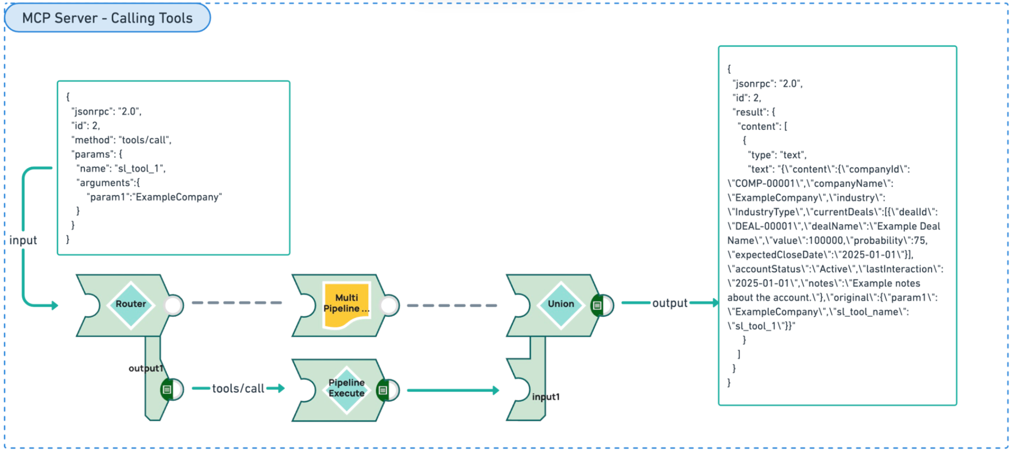 En enregistrant un serveur MCP, vous fournissez effectivement une API que les modèles de langage et d'autres clients peuvent utiliser pour effectuer des opérations telles que l'extraction, la transformation, l'enrichissement ou l'automatisation des données, le tout orchestré par des pipelines SnapLogic.