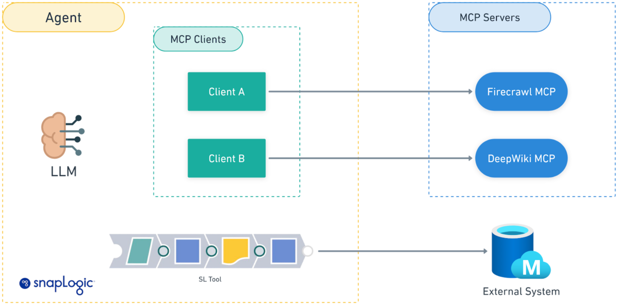 Les clients MCP dans SnapLogic permettent aux utilisateurs de se connecter aux serveurs MCP dans le cadre de leur agent. Un exemple peut être la connexion au serveur MCP Firecrawl pour un agent de récupération de données, ou d'autres cas d'utilisation qui peuvent tirer parti des serveurs MCP créés.