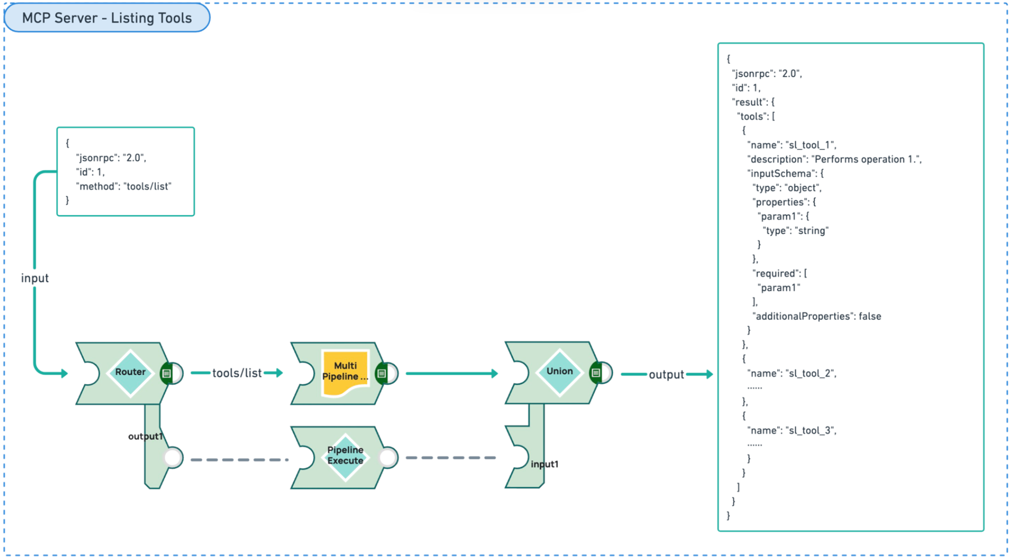 La première est la liste des outils, qui renvoie des métadonnées structurées décrivant les pipelines disponibles. Ces métadonnées comprennent le nom de l'outil, une description, le schéma d'entrée au format JSON Schema et toute autre information pertinente. Cela permet aux clients de découvrir dynamiquement quelles opérations sont disponibles pour être invoquées.