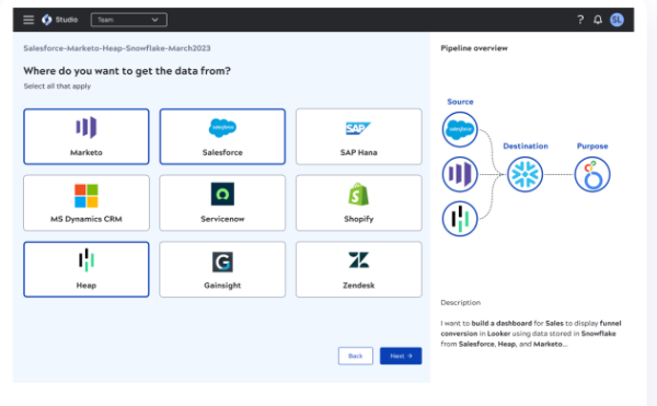 Cas d'utilisation: les équipes commerciales ont besoin de pipelines de données récurrents entre des systèmes tels que Salesforce, ServiceNow, Marketo ou Workday et des environnements d'analyse, mais dépendent fortement du soutien des ingénieurs de données.
