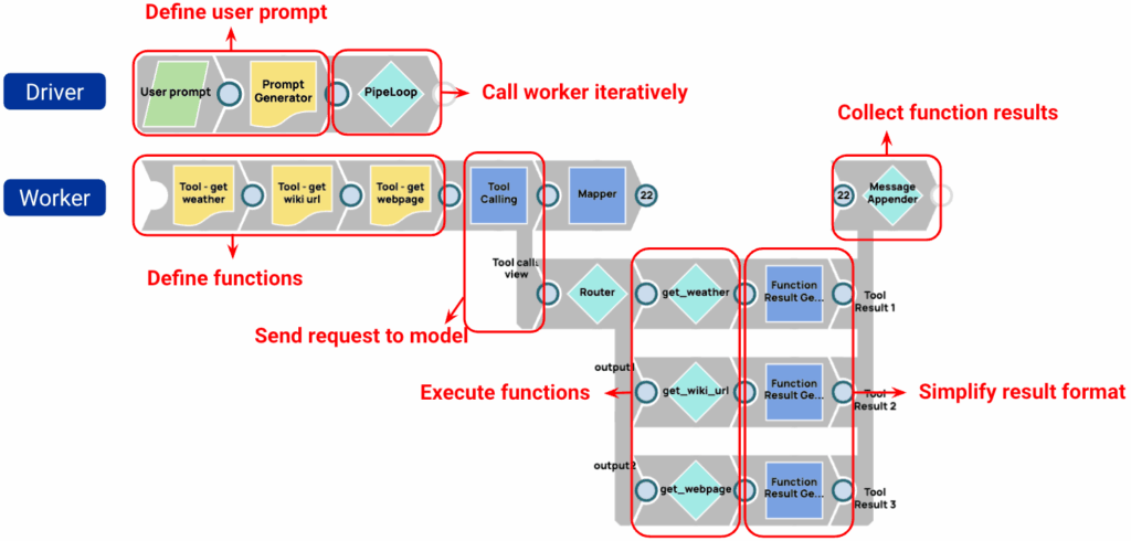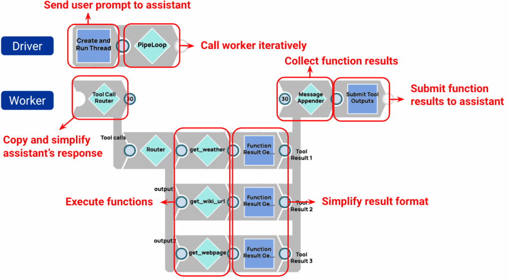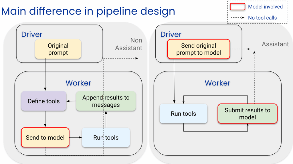 Al contrario, le pipeline assistenti prevedono due punti di interazione: il driver invia il prompt iniziale al modello, mentre il worker invia i risultati dello strumento al modello.