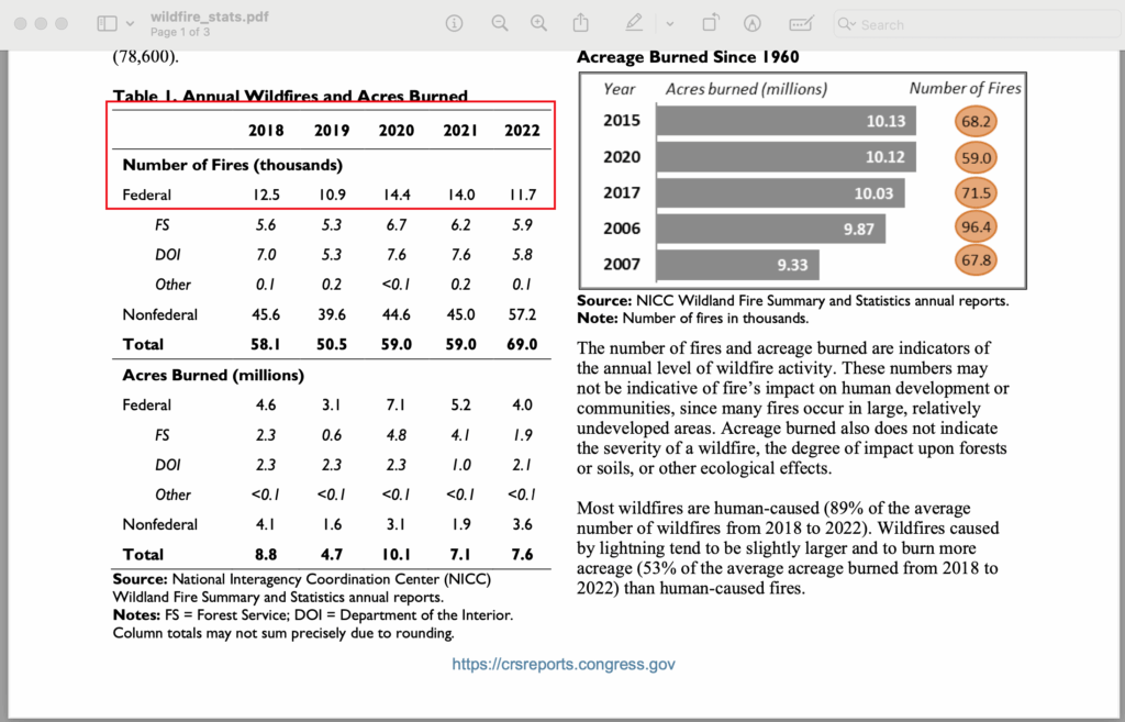 "value": "The number of federal fires between 2018 and 2022 is as follows:nn- 2018: 12,500n- 2019: 10,900n- 2020: 14,400n- 2021: 14,000n- 2022: 11,700【4:1†wildfire_stats.pdf】.",