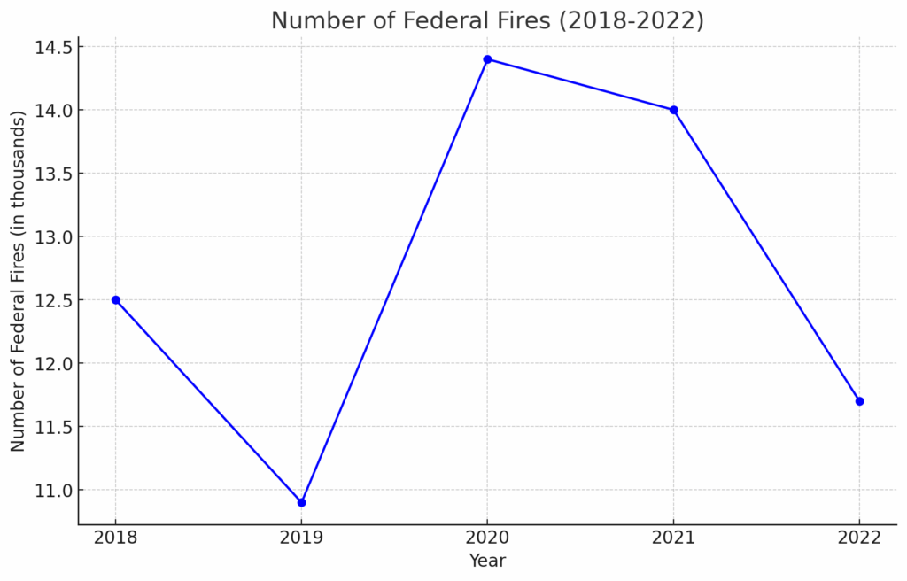 "value": "Here is the line chart showing the number of federal fires from 2018 to 2022. As you can see, there is a fluctuation in the number of fires over these years, with a peak in 2020.",
