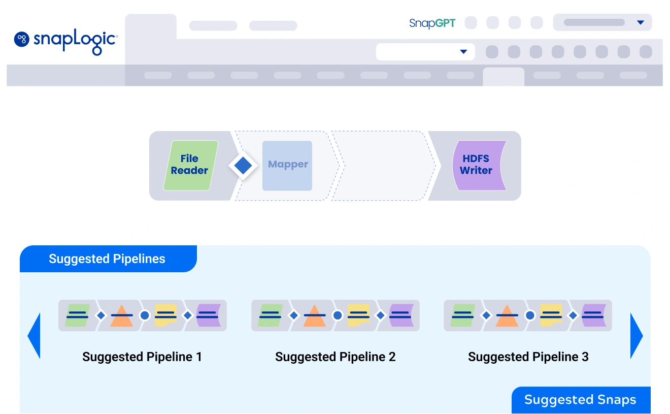 No SnapLogic experience? No problem! Get productive on the SnapLogic platform in days and proficient in weeks. Finish your integration projects sooner with our AI assistant at every step. With SnapLogic’s AI-driven AutoSuggest, we recommend potential workflows based on our -proven catalog of pipeline templates, so you can get up and running faster.